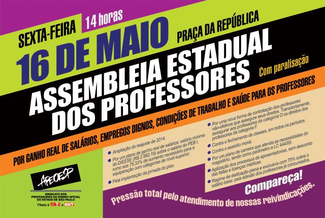 Sexta-feira, dia 16 de Maio às 14 horas na Praça da República - Assembleia Estadual dos Professores (com paralisação)